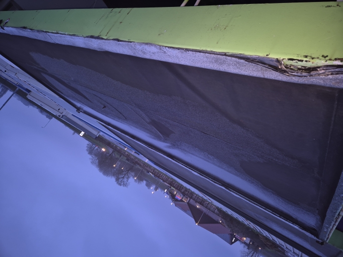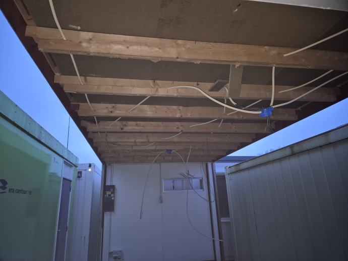 - Plafond met PE-folie, mineraalwol en afwerking in witte spaanplaat