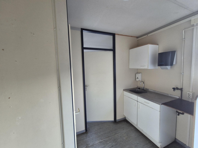 Direct uit voorraad leverbaar: Gebruikte unit afm. ca. 6,14x3,08 m. Entree met pantry en toilet ,en een kantoorruimte. Volledige buitenzijde nieuw in de verf.