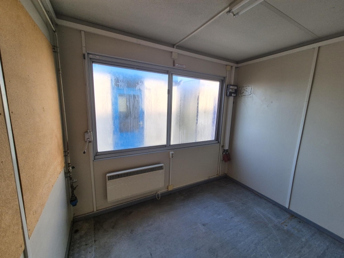 Direct uit voorraad leverbaar: Gebruikte unit afm. ca. 6,14x3,08 m. Entree met pantry en toilet ,en een kantoorruimte.